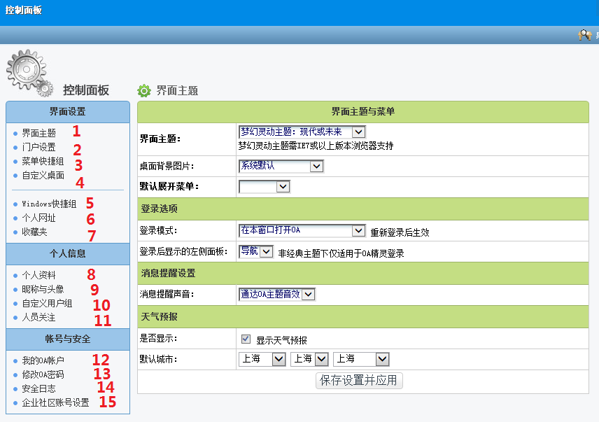 【個人事務】-【控制面板】包括界面主題、個人資料、我的帳戶等15個功能。